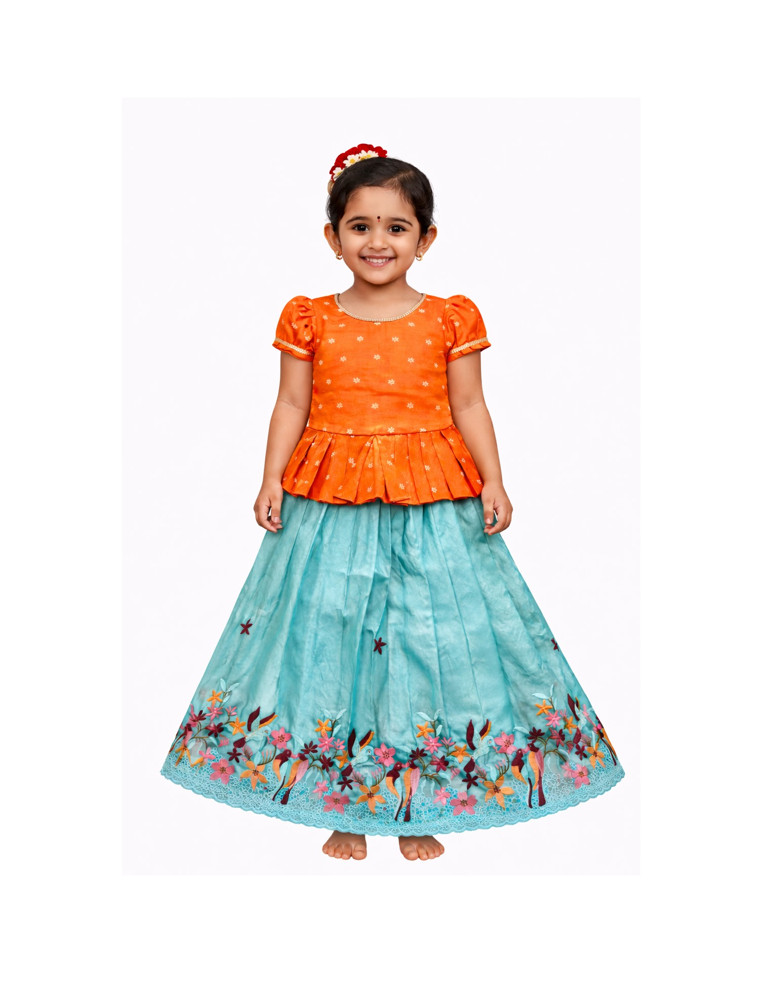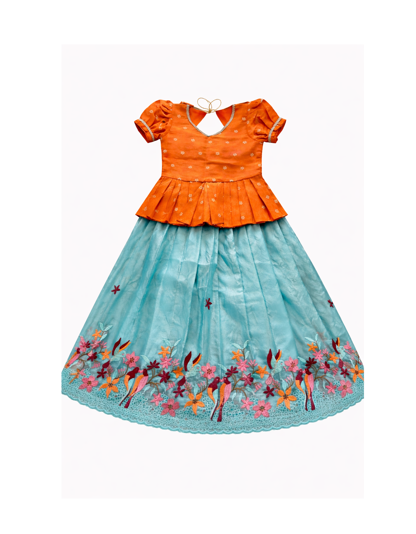 Bright Orange with golden border & Turquoise Blue Graceful Embroidery lehenga choli