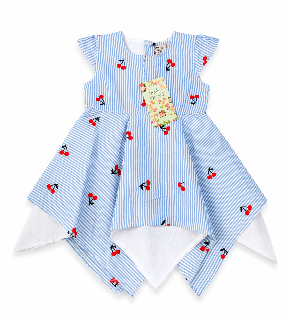 Sweet, stylish & perfect for your little princess! This adorable cherry stripe dress is ideal for special moments, playdates, parties, and everyday cuteness. It features soft, breathable fabric, flutter sleeves, and a layered handkerchief hem for a unique, trendy look. 🎀
