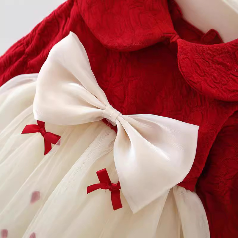 A long sleeved dress with a red top and a white, flared skirt featuring a large white bow at the waist.
